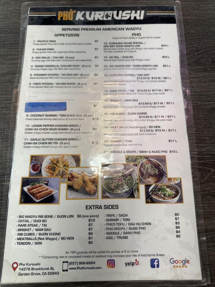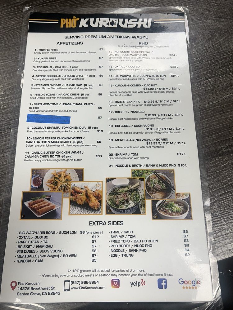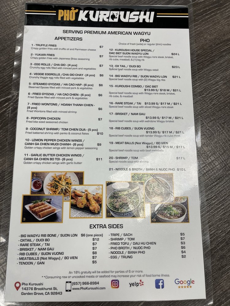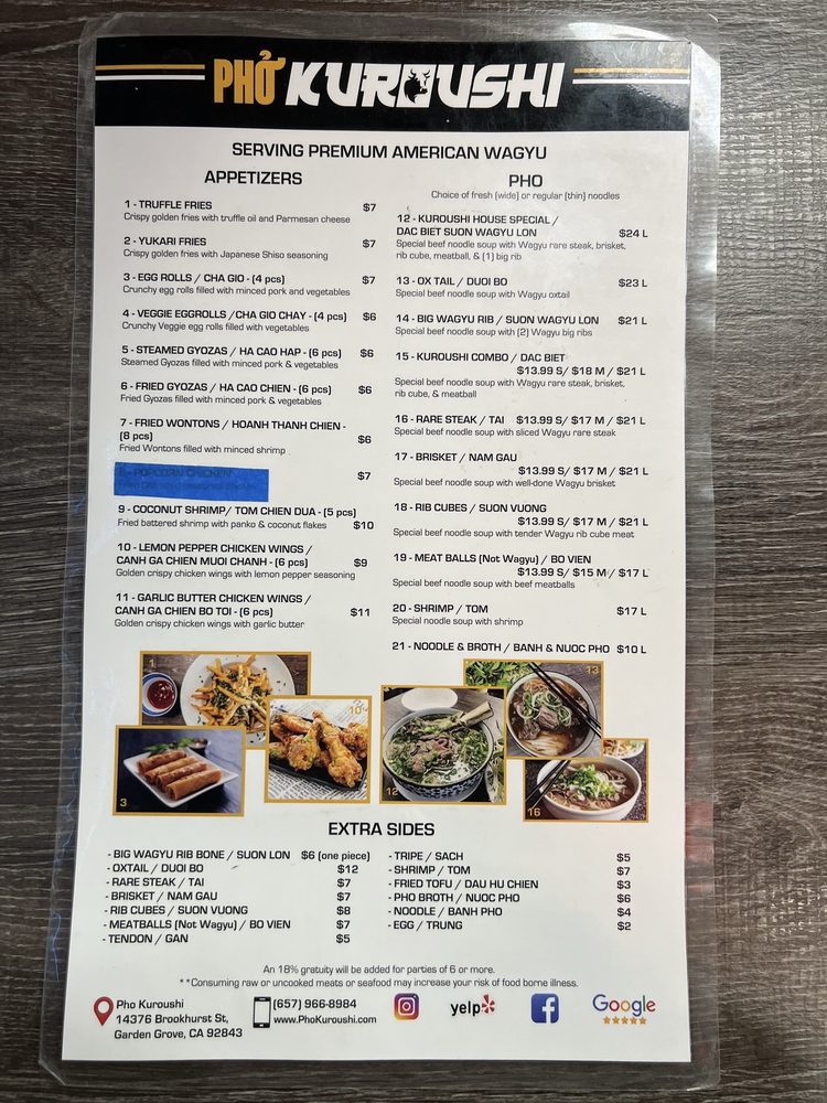 Introducing the menu at Pho Akaushi, a Vietnamese restaurant located in Garden Grove, CA, known for its flavorful dishes and top-notch service. The appetizers include Truffle Fries and Vietnamese Traditional Egg Rolls, both promising a delicious start to your meal. The Wagyu Pho options, such as Akaushi Combo and Rare Steak, showcase the restaurant's commitment to quality and taste. Don't miss out on the Beef Stew and Smoking Wagyu Fried Rice for a satisfying main course. Customers rave about the rich broth, tender meat, and perfectly cooked noodles, making Pho Akaushi a must-visit for pho enthusiasts. The cozy atmosphere, friendly service, and attention to detail add to the overall dining experience, making it a standout choice for Vietnamese cuisine. Enjoy the food, ambiance, and hospitality at Pho Akaushi for a memorable meal.