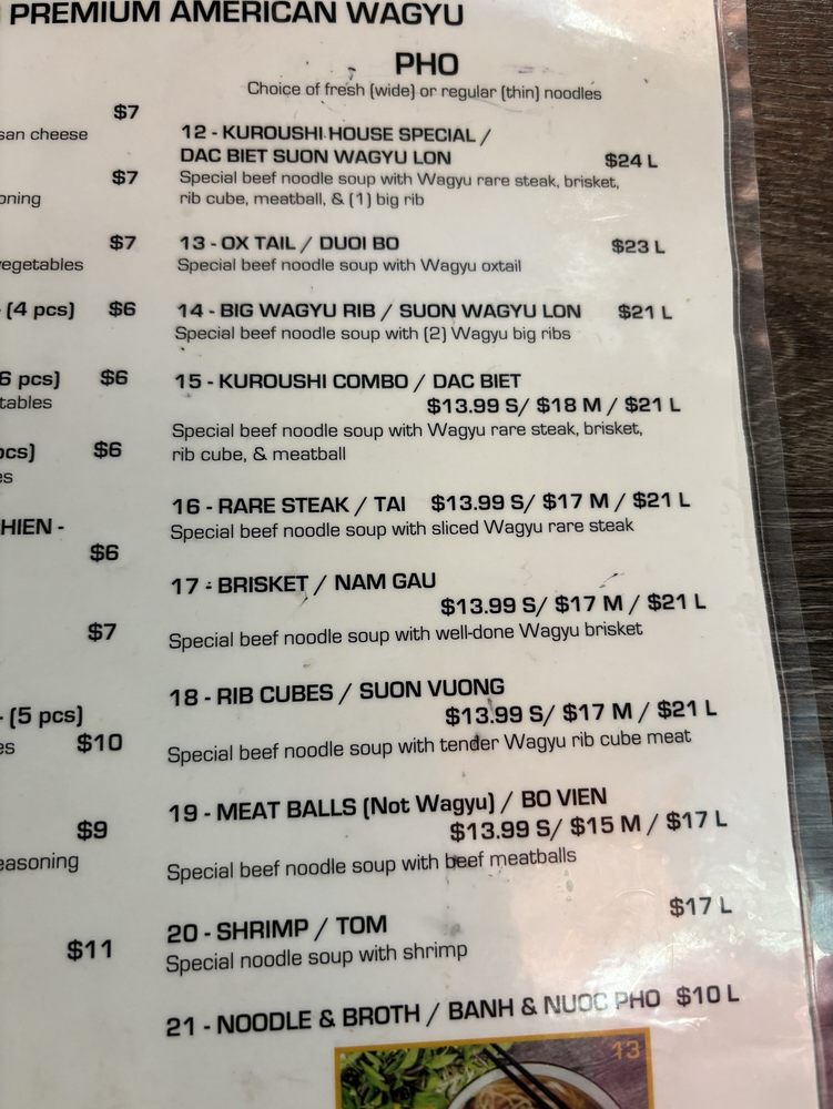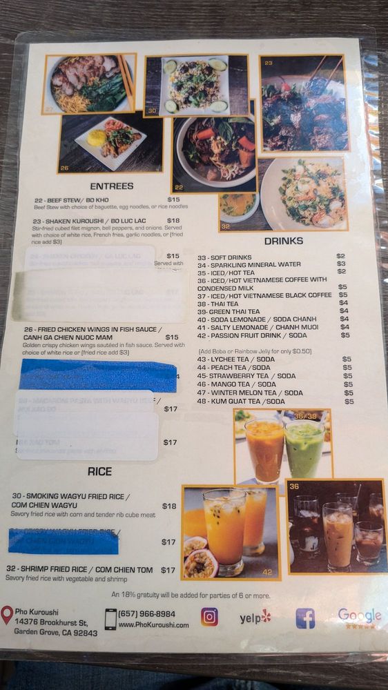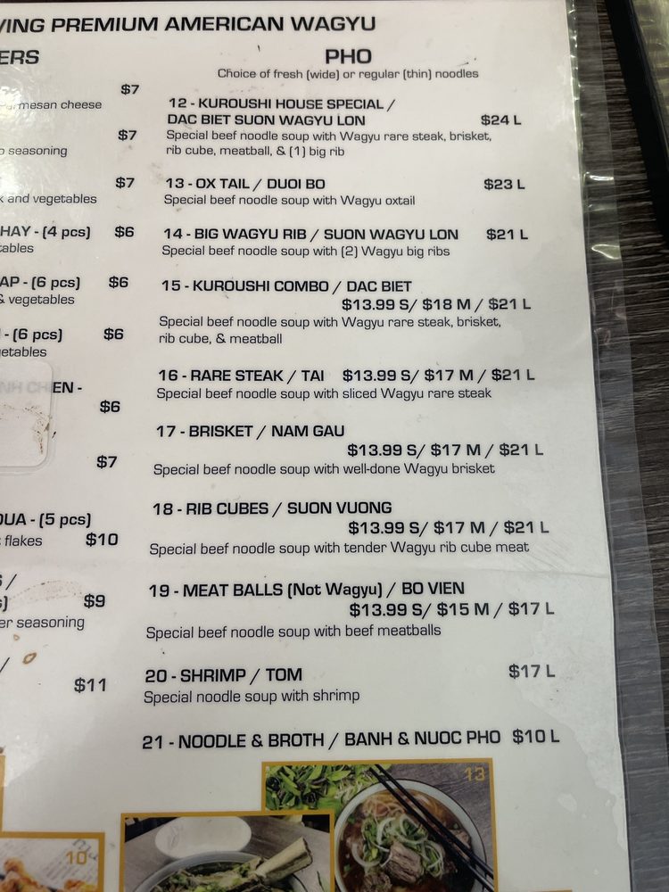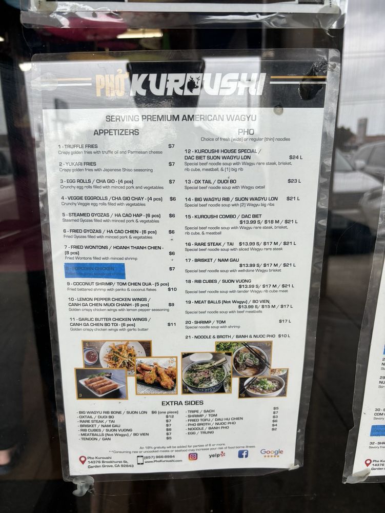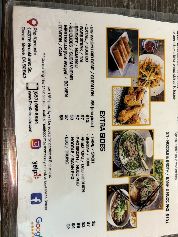 Introducing the menu at Pho Akaushi, a Vietnamese restaurant located in Garden Grove, CA, known for its flavorful dishes and top-notch service. The appetizers include Truffle Fries and Vietnamese Traditional Egg Rolls, both promising a delicious start to your meal. The Wagyu Pho options, such as Akaushi Combo and Rare Steak, showcase the restaurant's commitment to quality and taste. Don't miss out on the Beef Stew and Smoking Wagyu Fried Rice for a satisfying main course. Customers rave about the rich broth, tender meat, and perfectly cooked noodles, making Pho Akaushi a must-visit for pho enthusiasts. The cozy atmosphere, friendly service, and attention to detail add to the overall dining experience, making it a standout choice for Vietnamese cuisine. Enjoy the food, ambiance, and hospitality at Pho Akaushi for a memorable meal.